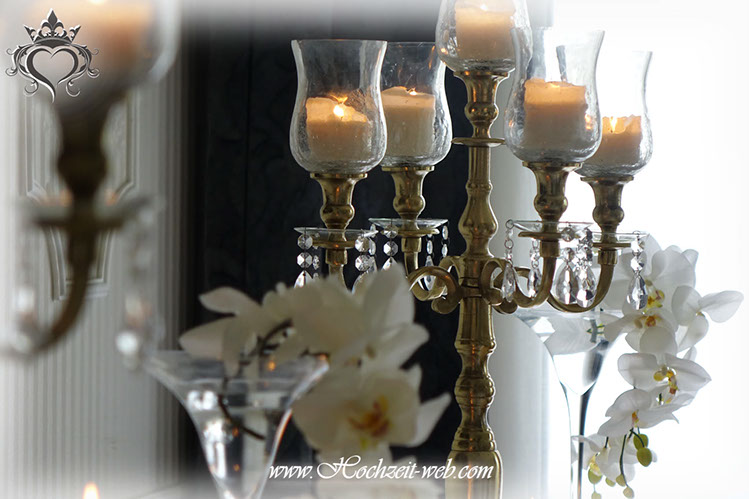 Stellen Sie einarmige oder mehr Armige Kerzenständer in verschiedenen Größen auf die Hochzeitstafel, den Brauttisch und in den Eingangsbereich. Mit den passenden, farblich abgestimmten Vasen, Blumen und Kerzen kommt jeder Kerzenständer zur Geltung und wird zum Highlight der Hochzeitsdeko.