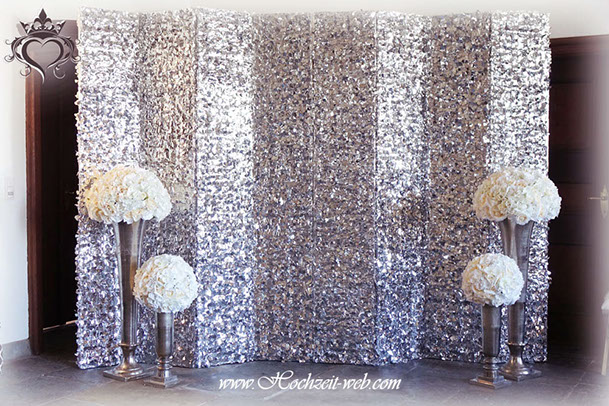 Die Dekoration der Fotoecke wird der des Festsaales angepasst, so dass auch diese sich harmonisch in das Gesamtbild einfügt. Mit Kerzenständern, Säulen, Bodenvasen und Blumen sowie farblich abgestimmten Tüchern als Wandverkleidung wird eine Ecke des Festsaales zu einer Fotoecke in der Sie sich mit jedem einzelnen Gast oder Ihrer Familie fotografieren lassen können. Traumhafte Hochzeitsdekoration für Ihre Hochzeit-Fotoecke.