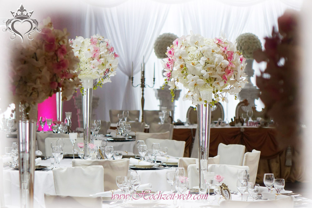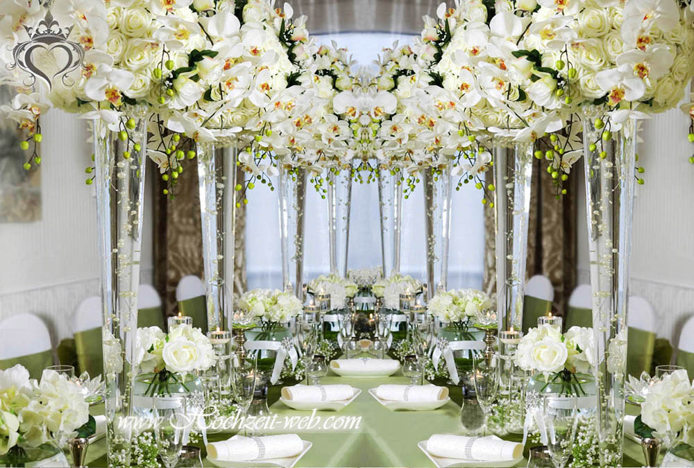 Jede Hochzeit ist immer ein besonderes eigenartiges Ereignis. Wir bieten Ihnen verschiedene Varianten von Tischdekoration, von elegant bis zur extravagant, von schlicht und edel bis königlich pompös. Sie haben auch die Möglichkeit die Tischdekoration so wie Glasvasen oder Porzellan Vasen zu mieten. Allerdings können wir die Vasen nicht mit der Post zusenden, die müssen abgeholt werden. Außer Vasen verleihen wir auch die Kerzenständer, Kerzenleuchter und weiße Stuhlhusse. Die Kerzenständer und Stuhlhusse können wir gerne mit der Post senden Rufen Sie uns an! Mieten Sie unsere Glasvasen für eine unvergessliche Märchenhochzeit.