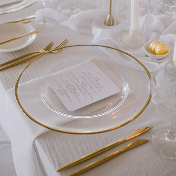 Von Chiavari Stühlen über Kristall- Weingläser zum schwarzen Besteck, unser Hochzeitsdekoration Verleih lieft alle Accessoires, Dekoartikel und Mobiliar, dass Sie für die Gestaltung einer unvergesslichen Hochzeit benötigen. Werfen Sie einen Blick in unseren digitalen Katalog oder besuchen Sie gleich nach Terminvereinbarung unseren Showroom, um ein Gefühl für unseren Stil und die Qualität unserer Waren zu bekommen. Mieten Sie bei uns goldenes Besteck in "Gold Eleganz" für eine unvergessliche Märchenhochzeit.