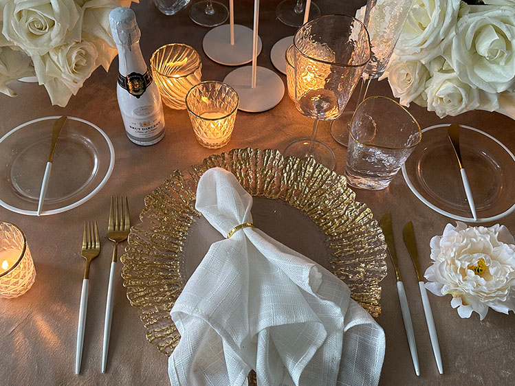 Wissenswert: Neben Platztellern können Sie bei uns auch das dazu passenden Essbesteck und die Gläser mieten, um ihre Hochzeitstafel optisch perfekt aufeinander abgestimmt zu gestalten.