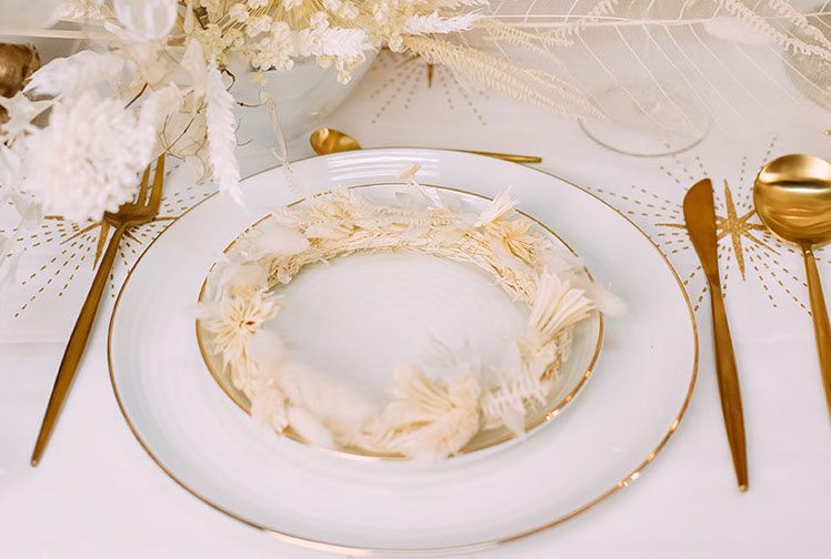 Porzellan Speiseteller mit Goldrand sind die perfekte Möglichkeit, Ihre Hochzeitstafel dekadent und hochwertig aussehen zu lassen. Unser Hochzeitsdekoration Verleih in Bielefeld sorgt für ein elegant und glamourös gedecktes Tisch.