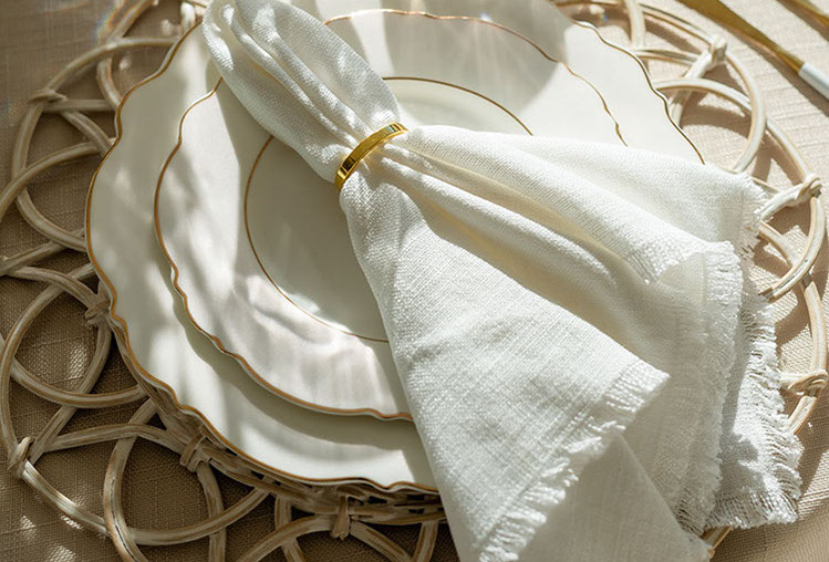 Unter einer stilvolle Hochzeit verstehen wir darum ein Fest, bei dem Tradition, Moderne und individuelle Charakter in harmonischem Einklang stehen. Denn eine Hochzeit ist ein traditioneller Anlass und ein gesellschaftliches Ritual, an das bestimmte Erwartungen geknüpft sind. Berücksichtigen Sie diese bei Ihren Vorbereitungen und verleihen Sie Ihrem Fest zugleich auf charmante Art und Weise eine ganz persönliche Note. Denn Ihre Hochzeit ist Ihr Tag, Sie allein entscheiden, wie dieser gestaltet werden soll. Bei uns weiße Servietten mieten - Stoffservietten mit Fransen. Mieten Sie unsere hochwertigen Stoffservietten aus 100 % Baumwolle Stoff.