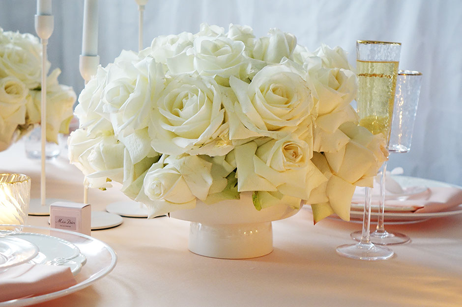 Romantische Tischdekoration mit Trompeten Glas Vasen für runde und eckige Tische.