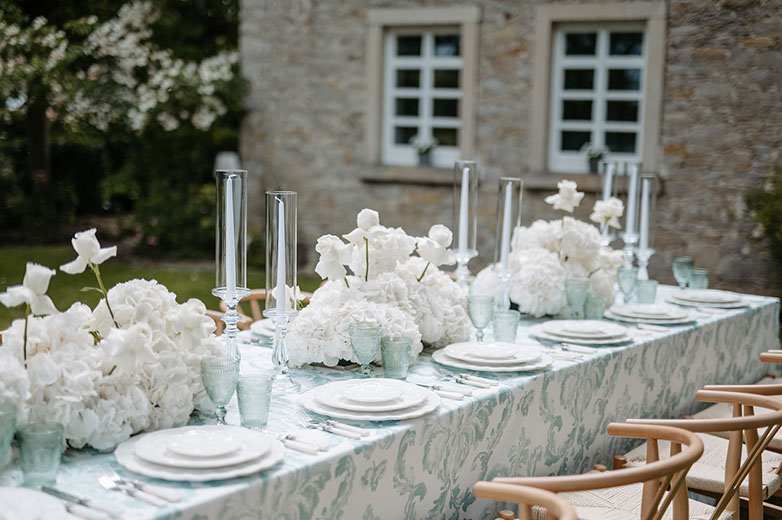 Silber: Die silbernen Kerzenständer unseres Verleihs strahlen ein extravagantes Flair aus. Die kühle Eleganz der Leuchten kombiniert mit unseren silbernen Platztellern und dazwischen noch sehr viel Grün, da wird jede Hochzeitstafel zum Hingucker.