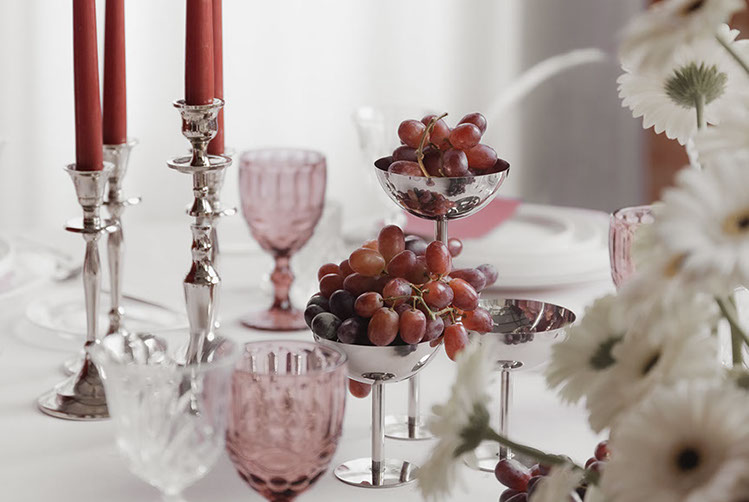 Silber: Die silbernen Kerzenständer unseres Verleihs strahlen ein extravagantes Flair aus. Die kühle Eleganz der Leuchten kombiniert mit unseren silbernen Platztellern und dazwischen noch sehr viel Grün, da wird jede Hochzeitstafel zum Hingucker.