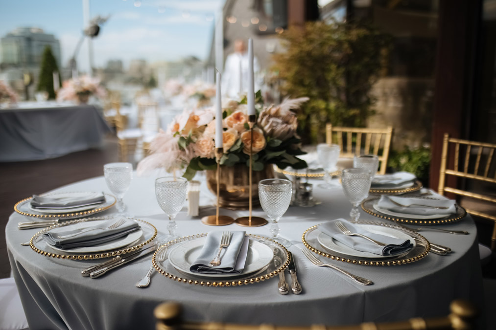 Silber: Die silbernen Kerzenständer unseres Verleihs strahlen ein extravagantes Flair aus. Die kühle Eleganz der Leuchten kombiniert mit unseren silbernen Platztellern und dazwischen noch sehr viel Grün, da wird jede Hochzeitstafel zum Hingucker.