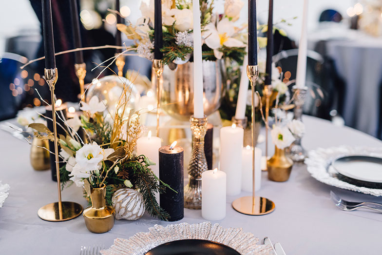 -Schwarz: Auffällige Kerzenständer in Schwarz im typischen Rokoko-Stil sorgen für einen unvergleichlichen Hingucker auf jeder Hochzeitstafel.