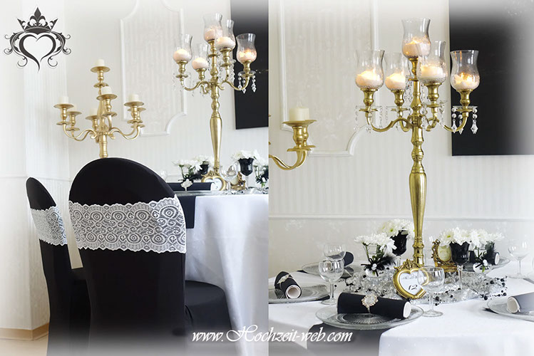 -Schwarz: Auffällige Kerzenständer in Schwarz im typischen Rokoko-Stil sorgen für einen unvergleichlichen Hingucker auf jeder Hochzeitstafel.