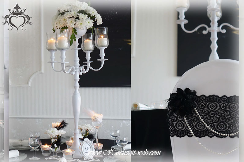 -Schwarz: Auffällige Kerzenständer in Schwarz im typischen Rokoko-Stil sorgen für einen unvergleichlichen Hingucker auf jeder Hochzeitstafel.