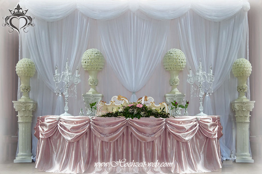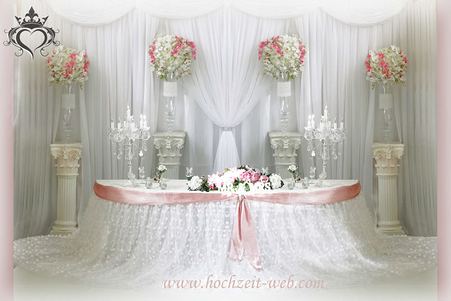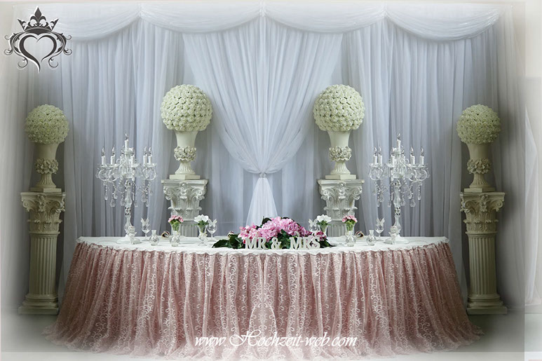 Romantische Tischdekoration mit Säulen für den Brauttisch.