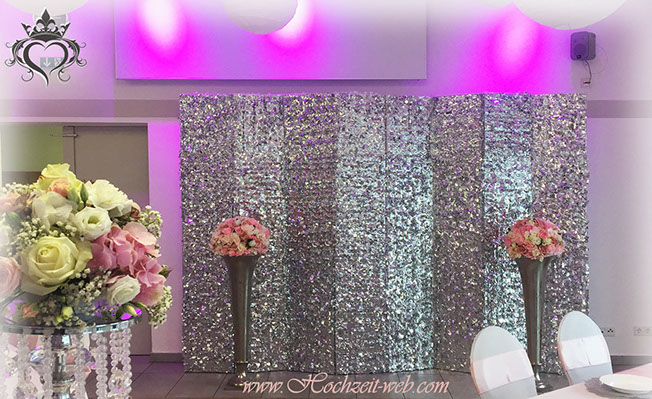 Die Dekoration der Fotoecke wird der des Festsaales angepasst, so dass auch diese sich harmonisch in das Gesamtbild einfügt. Mit Kerzenständern, Säulen, Bodenvasen und Blumen sowie farblich abgestimmten Tüchern als Wandverkleidung wird eine Ecke des Festsaales zu einer Fotoecke in der Sie sich mit jedem einzelnen Gast oder Ihrer Familie fotografieren lassen können. Traumhafte Hochzeitsdekoration für Ihre Hochzeit-Fotoecke.
