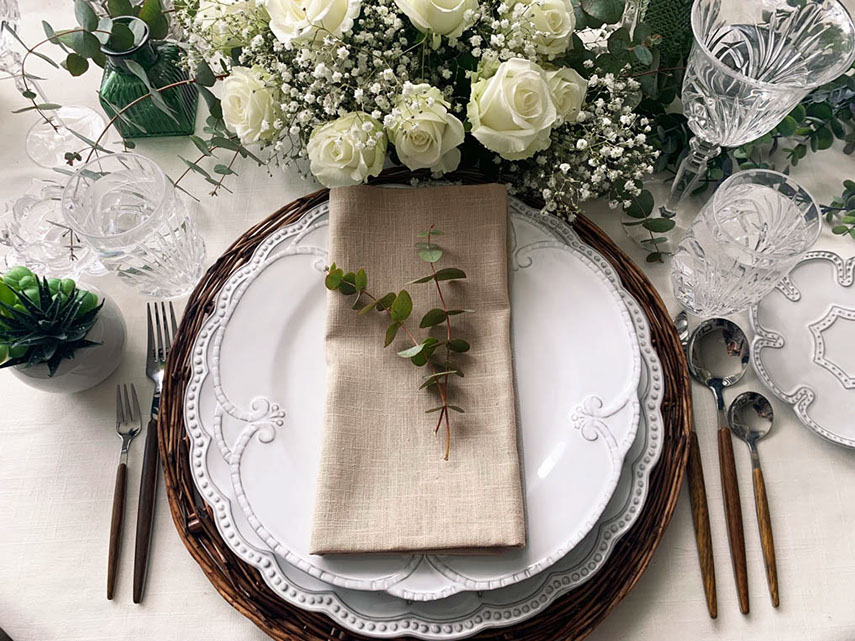Unter einer stilvolle Hochzeit verstehen wir darum ein Fest, bei dem Tradition, Moderne und individuelle Charakter in harmonischem Einklang stehen. Denn eine Hochzeit ist ein traditioneller Anlass und ein gesellschaftliches Ritual, an das bestimmte Erwartungen geknüpft sind. Berücksichtigen Sie diese bei Ihren Vorbereitungen und verleihen Sie Ihrem Fest zugleich auf charmante Art und Weise eine ganz persönliche Note. Denn Ihre Hochzeit ist Ihr Tag, Sie allein entscheiden, wie dieser gestaltet werden soll. Bei uns Leinen Servietten mieten - Stoffservietten aus 100 % Leinen in verschiedenen Farben.