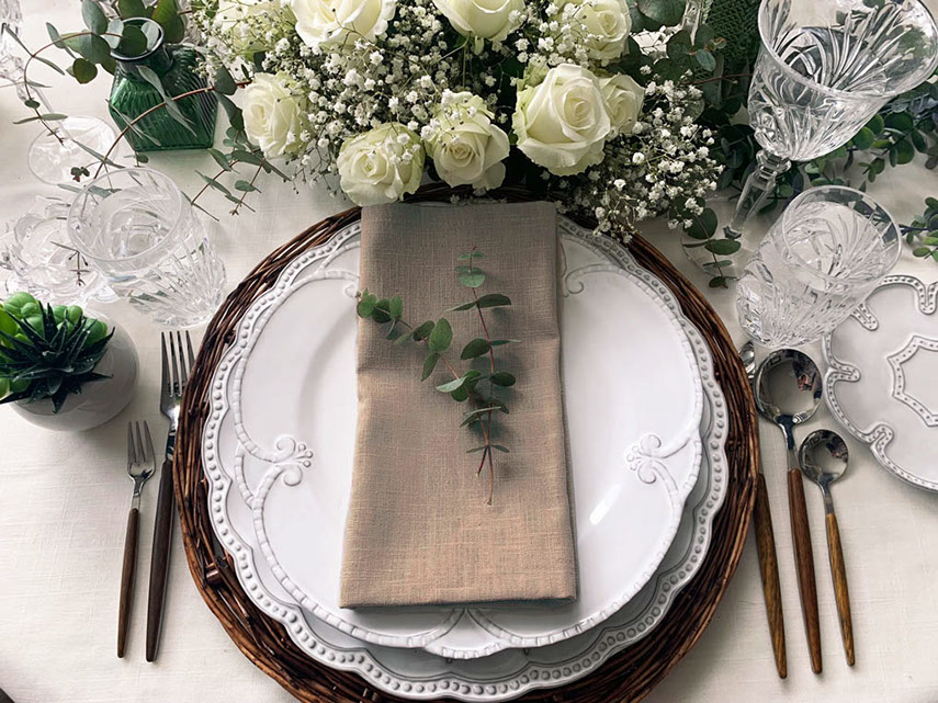 Unter einer stilvolle Hochzeit verstehen wir darum ein Fest, bei dem Tradition, Moderne und individuelle Charakter in harmonischem Einklang stehen. Denn eine Hochzeit ist ein traditioneller Anlass und ein gesellschaftliches Ritual, an das bestimmte Erwartungen geknüpft sind. Berücksichtigen Sie diese bei Ihren Vorbereitungen und verleihen Sie Ihrem Fest zugleich auf charmante Art und Weise eine ganz persönliche Note. Denn Ihre Hochzeit ist Ihr Tag, Sie allein entscheiden, wie dieser gestaltet werden soll. Bei uns Leinen Servietten mieten - Stoffservietten aus 100 % Leinen in verschiedenen Farben.