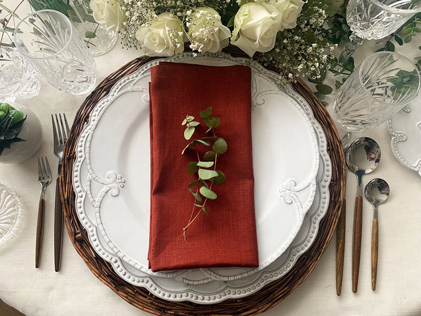 Wir versenden die Servietten deutschlandweit, sodass Sie auch bei Ihrer Hochzeit den gewünschten Stil und den guten Geschmack genießen können. Mit unseren Servietten verleihen Sie Ihrem Tisch eine exklusive Eleganz und werden dabei noch Budget schonender sein, da Sie die Servietten mieten können. Probieren Sie es aus und mieten Sie unsere Leinen Servietten in Bielefeld! Rost Leinen Servietten mieten Stoffservietten aus 100 % Leinenstoff.