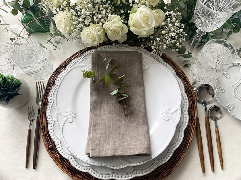 Unter einer stilvolle Hochzeit verstehen wir darum ein Fest, bei dem Tradition, Moderne und individuelle Charakter in harmonischem Einklang stehen. Denn eine Hochzeit ist ein traditioneller Anlass und ein gesellschaftliches Ritual, an das bestimmte Erwartungen geknüpft sind. Berücksichtigen Sie diese bei Ihren Vorbereitungen und verleihen Sie Ihrem Fest zugleich auf charmante Art und Weise eine ganz persönliche Note. Denn Ihre Hochzeit ist Ihr Tag, Sie allein entscheiden, wie dieser gestaltet werden soll. Bei uns Leinen Servietten mieten - Stoffservietten aus 100 % Leinen in verschiedenen Farben.