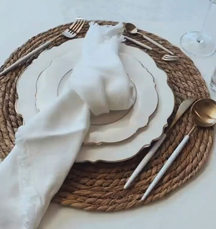Der Platzteller auf der Hochzeitstafel dient nicht nur als Eyecatcher, sondern sorgt auch für eine optische Verbindung zwischen Tischdeko und Essgeschirr. Gleichzeitig hat der Teller natürlich einen praktischen Aspekt, jeder Hochzeitsgast weiß, welcher Platz für ihn vorgesehen ist. Sie sind auf der Suche nach „den Platztellern“, die perfekt zu Tafeldekoration ihrer Hochzeit passen sollen, werfen Sie einen Blick in unser facettenreiches Angebot. Wir führen Platzteller unterschiedlichster Stilrichtungen, die Sie zu attraktiven Preisen mieten können. Wir haben für jeden Bedarf die richtige Lösung. Bei uns können Sie ihre komplette Hochzeitsdeko zu attraktiven Preisen mieten. Von Chiavari -Stühlen über Kristall-Weingläser zum schwarzen Besteck, unser Hochzeitsdeko -Verleih lieft alle Accessoires, Dekoartikel und Mobiliar, dass Sie für die Gestaltung einer unvergesslichen freien Trauung benötigen. Werfen Sie einen Blick in unseren digitalen Katalog oder besuchen Sie gleich unseren Showroom, um ein Gefühl für unseren Stil und die Qualität unserer Waren zu bekommen. Mieten Sie unsere Platzteller für eine unvergessliche Märchenhochzeit. Bei uns Platzteller mieten aus Rattan Tischsets Verleih in Bielefeld.