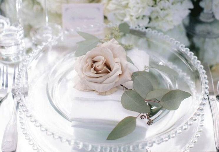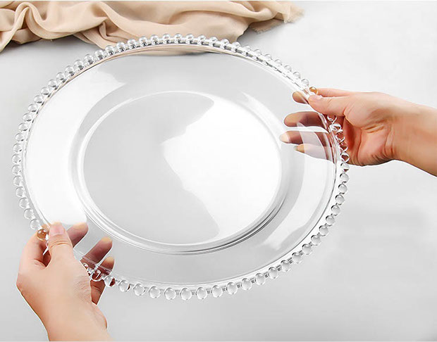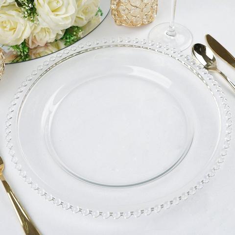 Wer eine kühle Eleganz auf der Hochzeitstafel bevorzugt, für den sind unsere Glasplatzteller mit silbernen Perlen genau das Richtige.